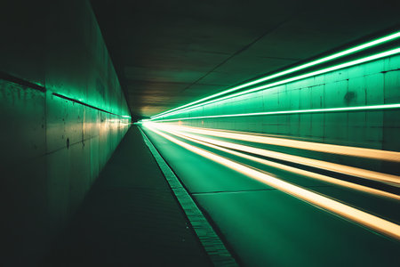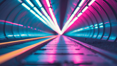 Immersive neon lights speed tunnel background showcasing vibrant, glowing streaks of light in a futuristic, high-tech design. Ideal for sci-fi, AI, or digital innovation themes with dynamic