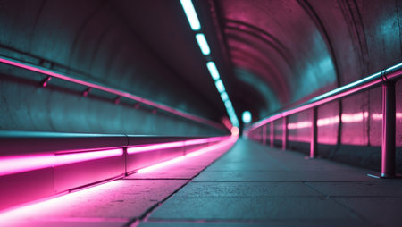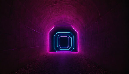 Dark tunnel illuminated by vivid neon light creates a mysterious atmosphere. Circular patterns along the walls draw the viewer into an inviting yet eerie space.