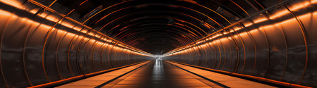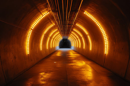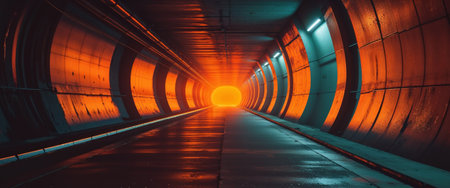 AI Generated. Bright orange glow illuminates an industrial tunnel at night with a futuristic vibe