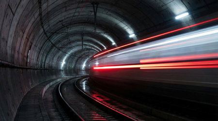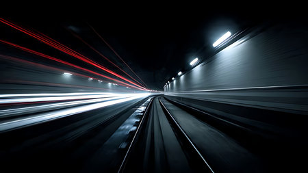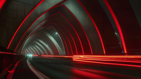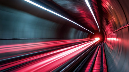 A dynamic image of a dark tunnel illuminated by vibrant red light trails, symbolizing speed and motion in urban transportation, perfect for creative projects.