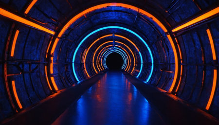 Tunnel glowing with striking blue and orange colors, illuminated by bright lights,
