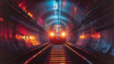 Exploring the Depths of Urban Transit as a Subway Train Emerges From a Tunnel Illuminated by Colorful Lights Generative AI