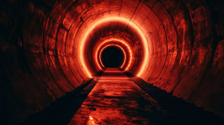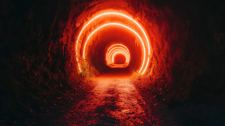 This captivating image showcases vibrant red light trails illuminating a dark tunnel. The hypnotic circular patterns create a mysterious and surreal atmosphere. Perfect for creative projects.