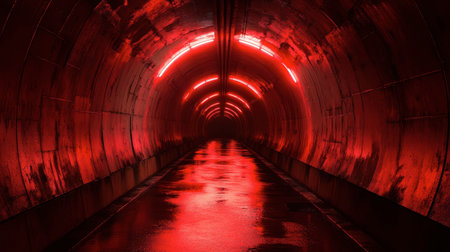 An atmospheric view of a dark tunnel illuminated by glowing red lights, with reflections shimmering on the wet surface, creating a mysterious and eerie ambiance.