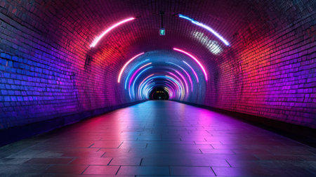 Futuristic brick tunnel flooded with vibrant, contrasting neon tones.