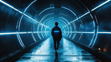 A miner walking through a dark tunnel illuminated by blue neon headlamps