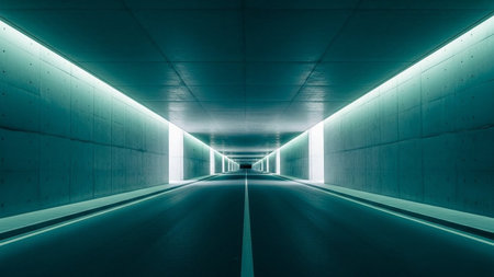 A long, straight tunnel stretches into the distance, its concrete walls illuminated by vibrant, glowing teal lights that create a futuristic and sleek atmosphere. The road surface is dark asphalt with a clear white line marking the center, leading the eye towards a distant vanishing point. The lighting is bright and consistent, casting a cool, modern glow throughout the passage. evokes a sense of advanced technology, speed, and an endless journey.