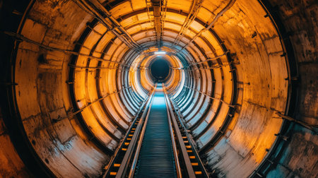 This atmospheric image captures a warmly lit tunnel with curved train tracks, showcasing textures and shadows that evoke a sense of mystery and exploration in a railway environment.