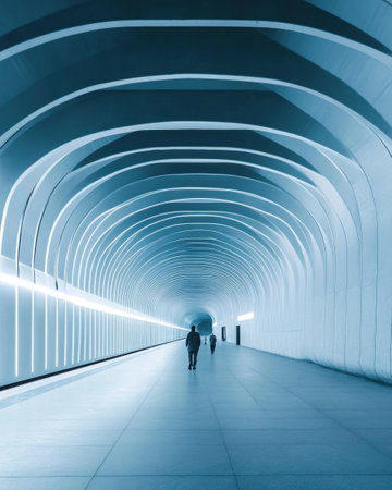 Two individuals walk through a stylish, futuristic tunnel featuring smooth arches and soft blue lighting, creating a serene atmosphere during the evening.