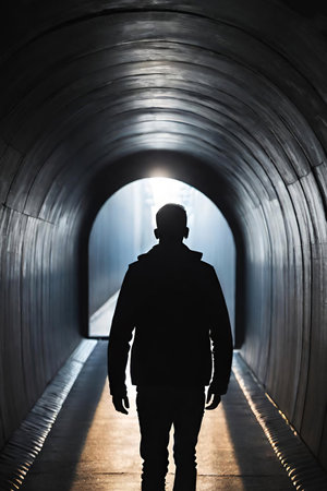 A powerful image featuring the silhouette of a man walking towards the light at the end of a tunnel.