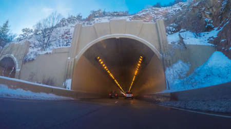 highway tunnel and river canyon in Rocky Mountains of Colorado - Poudre River at Little Narrows in winter scenery, aerial perspective