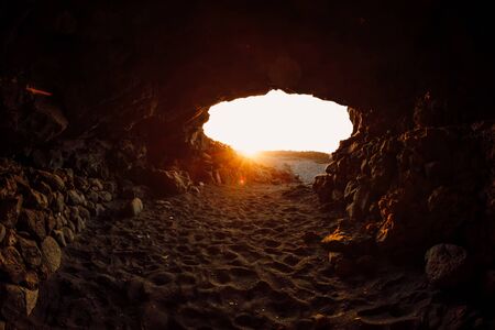 Cave lit by sun rays sunset evening nature exploration travel background rocks cliffs mountains seaside hiking tourist destination adventure spirit geology shiny sunny weather photography wallpaper