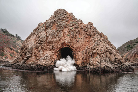 Large rock formation with a natural archway, through which powerful waves are surging. The water is splashing and foaming, creating a dynamic and dramatic scene at the edge of the ocean.