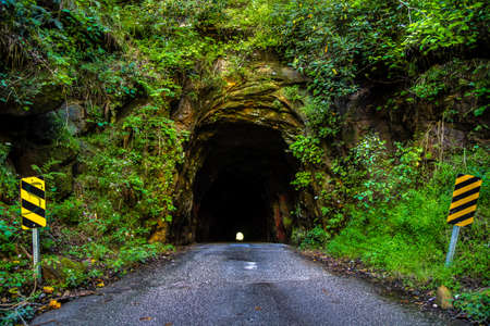 Car is driving through a tunnel on the Blue Ridge Parkway near Asheville, North Carolina