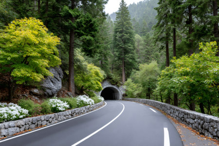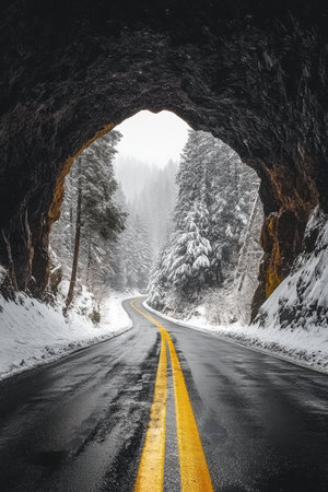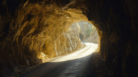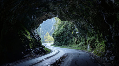 The journey ahead is shrouded in shadow as the road enters a tunnel that seems to swallow it whole. . AI generation