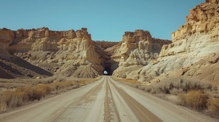 The open expanse of a desert gives way to a long straight road that disappears into a tunnel carved into a massive sandstone formation . AI generation