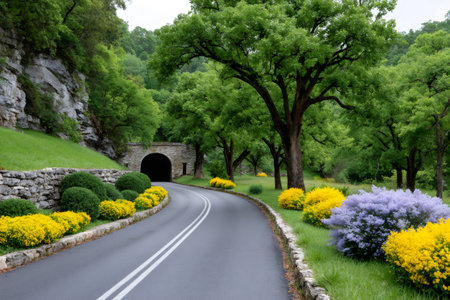 Scenic road winding towards a stone tunnel surrounded by green trees and colorful flowers in spring