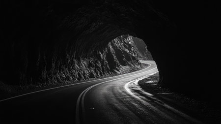 A captivating black and white photograph depicting a winding road leading through a dark tunnel. The image highlights intricate rock formations bathed in soft light, creating a dramatic contrast. Perfect for themes of adventure, travel, and nature.