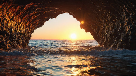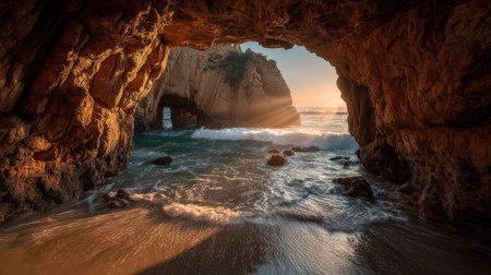 Discover a breathtaking coastal scene featuring a stunning cave opening with golden sunrise rays illuminating gentle waves, creating a serene atmosphere.