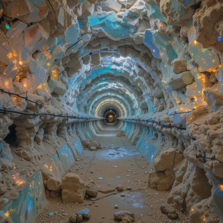 A majestic train snakes through a dark mountain tunnel, disappearing into the depths as it travels on its mysterious underground path.