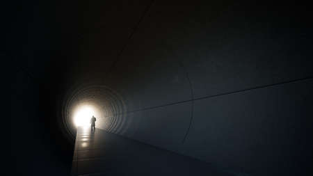 Concept or conceptual dark tunnel with a bright light at the end or exit as metaphor to success, faith, future or hope, a black silhouette of walking man to new opportunity or freedom 3d illustration