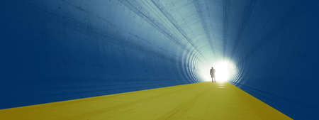 Concept or conceptual blue and yellow tunnel, the Ukrainian flag colors, with a bright light at the end as metaphor to hope and faith. A 3d illustration of a black silhouette of walking man to freedom