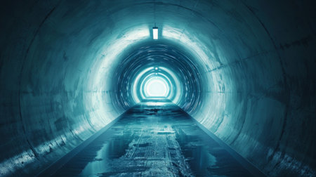 Light at the end of a tunnel with blue illumination. Concept of hope, journey, unknown destination, and enlightenment.