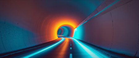Tunnel glowing with striking blue and orange colors, illuminated by bright lights,