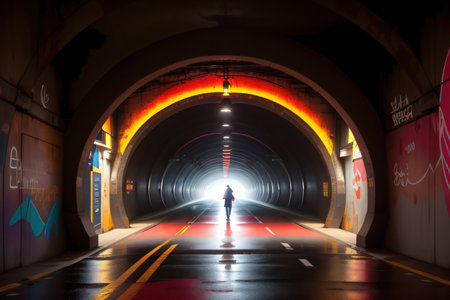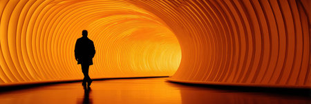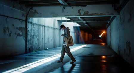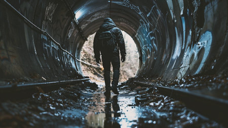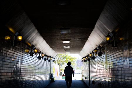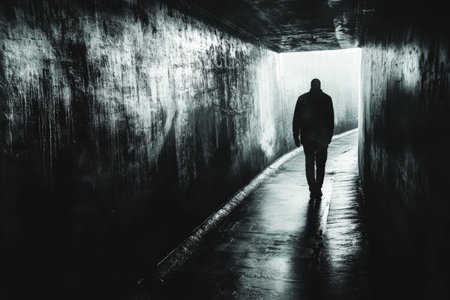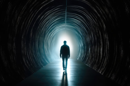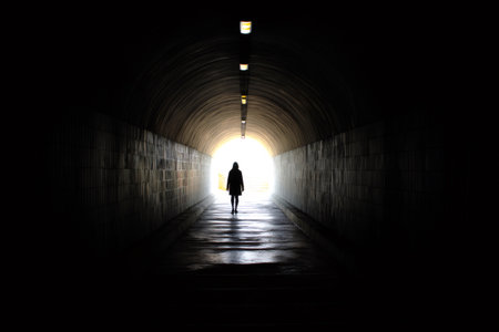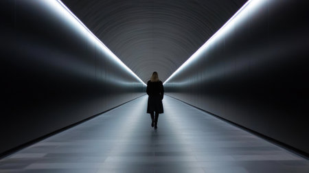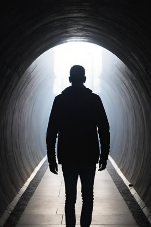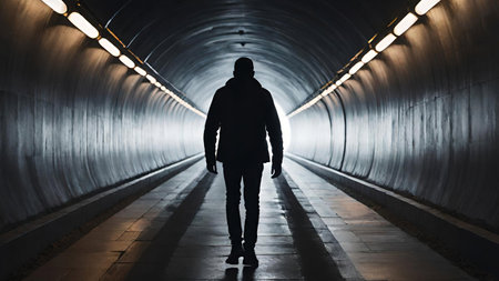 A mysterious silhouette of a person walking alone through a dimly lit tunnel, with light at the end, evoking a sense of solitude and intrigue.