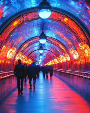 A long tunnel is filled with people walking towards the end. The tunnel features a curved ceiling illuminated by vibrant red, blue, and orange lights. The lighting creates a dynamic perspective, emphasizing the depth of the space. It could be used in editorial contexts, such as articles related to infrastructure, urban development, or public spaces.