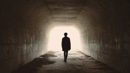 Walking through a dark subway tunnel, a silhouette moves toward a bright exit light, symbolizing hope, freedom, and the journey ahead