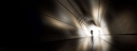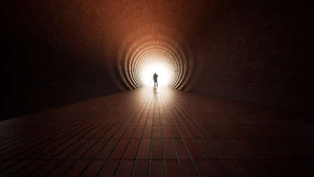 Concept or conceptual dark tunnel with a bright light at the end or exit as metaphor to success, faith, future or hope, a black silhouette of walking man to new opportunity or freedom 3d illustration