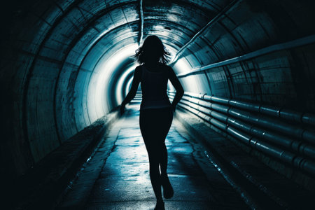Silhouette of a woman running in a dark underground tunnel.