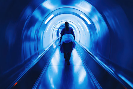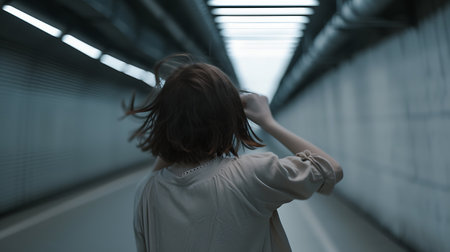 A woman with a backpack walking down an empty tunnel, AI