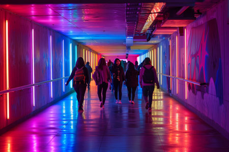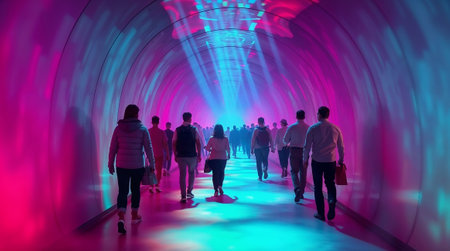 Tourists walking inside a modern illuminated tunnel with vibrant, colorful lights. Ai generated image