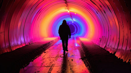 Silhouette of Person Walking in Vibrant Illuminated Tunnel with Colorful Glowing Lights