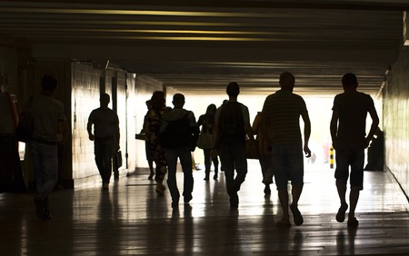 Silhouettes of people walking in a dark tunnel against a white glow