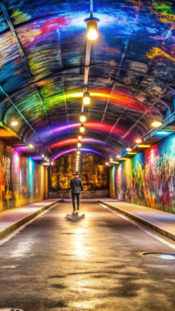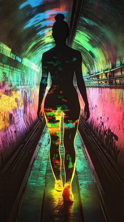 A woman walks confidently through a dimly lit urban tunnel, her silhouette glowing with vivid colors. The surrounding graffiti and light create a captivating atmosphere.