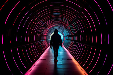 Silhouette of a man in a futuristic tunnel with neon lights