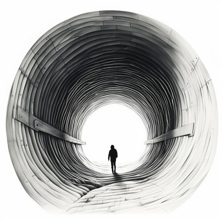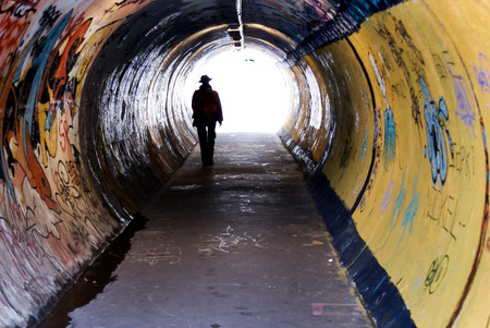 A lone figure walks towards a light at the end of a dark, curved tunnel.