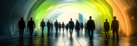 Futuristic neon light corridor displaying silhouettes of people, symbolizing hope and journey ahead.