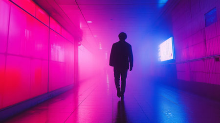 Silhouette of a man walking in a corridor with neon lights