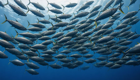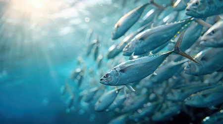 An underwater spectacle featuring a lively school of tuna with the independent spirit of sea life in vivid captivating detail