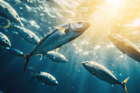Several tuna swim gracefully through deep blue waters, illuminated by sunlight filtering from above. The composition showcases these marine animals in their natural environment. This image could be used in various commercial applications, including educational materials and environmental awareness campaigns.