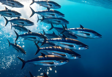 A group of tuna fish swim through the deep blue ocean, illuminated by overhead sunlight. The image showcases the streamlined forms and silvery-blue hues of the fish. This underwater scene, featuring dynamic composition and natural lighting, is suitable for editorial or commercial applications.