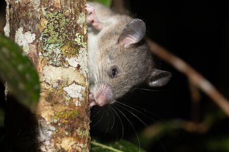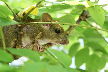 Rat on tree, Hiding of mice , Rodent in the bush, Close-up mouse with green leave in background