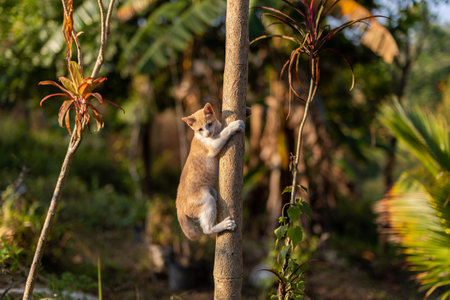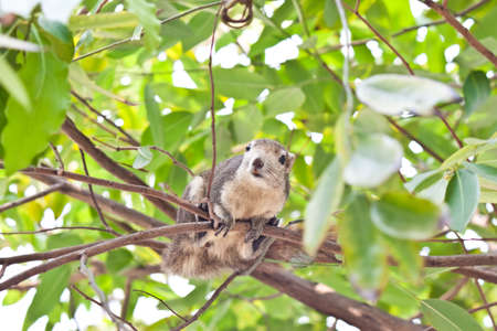 A squirrel at the wonderful beauty tropical island Sri Lanka is sitting on a tree and nibbles at a blossom