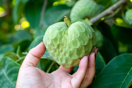 Plantations of cherimoya custard apple fruits in Granada-Malaga Tropical Coast subtropical region, Andalusia, Spain, green cherimoya growing on tree