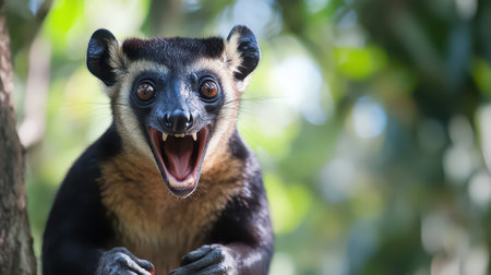 A close up view of a unique animal in a lush green environment showcasing its open mouth with a playful demeanor.