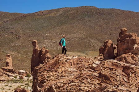 A red-haired girl stands on top of a large stone in the valley of stones. Bolivia